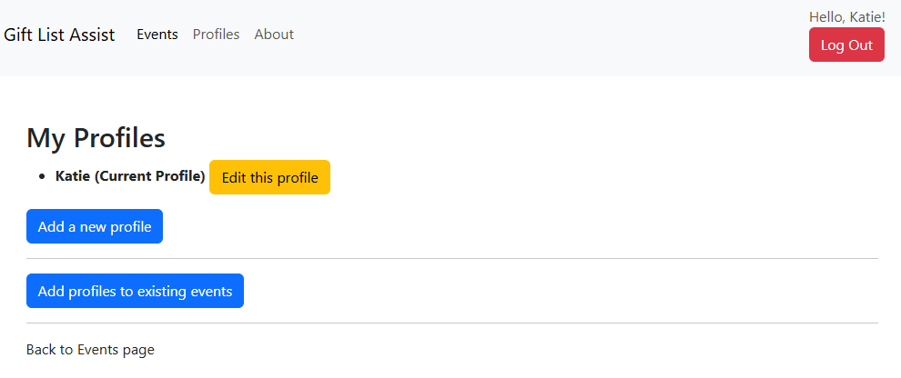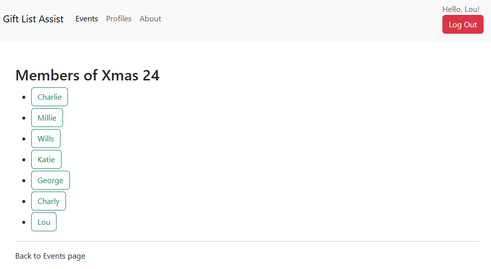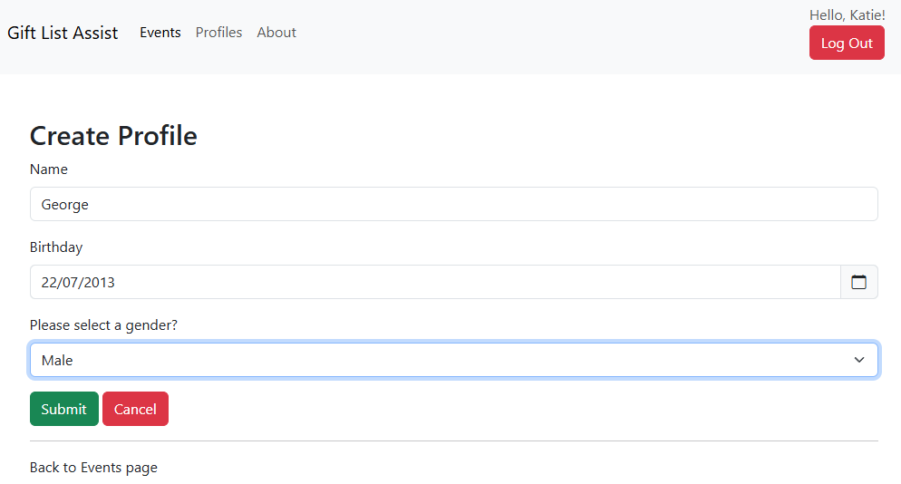 Katie is Charlies' (from the previous story) daughter in law and the wife of Will. She's been invited to the Christmas 2024 event. Katie and Will have three kids, George, Charly and Lou. All of whom are too young to have their own email address and would likely forget their GLA password anyway. To keep them included Katie can create profiles for each of them under her own account. She'll be the only one who can log in and will receive emails but each of the kids will appear like full users.