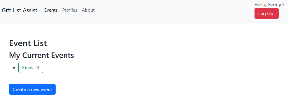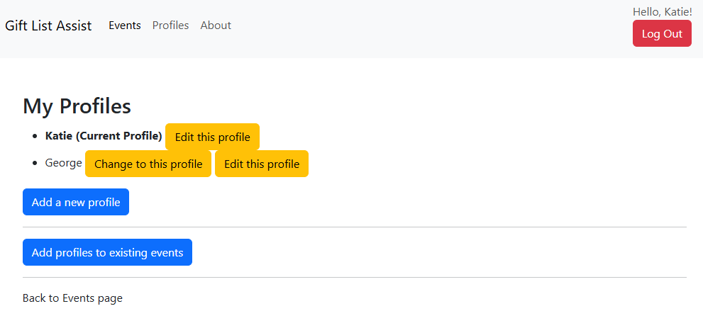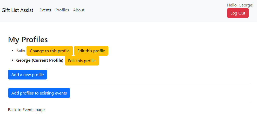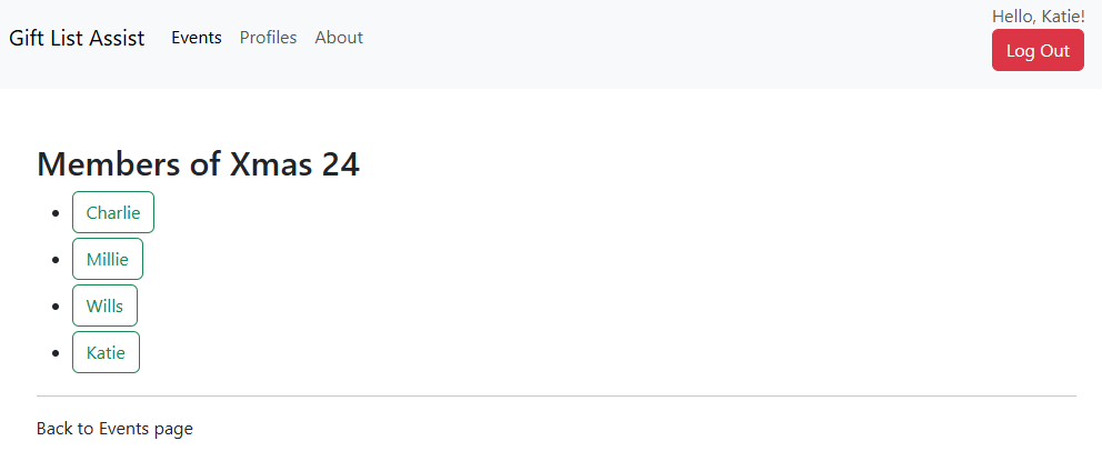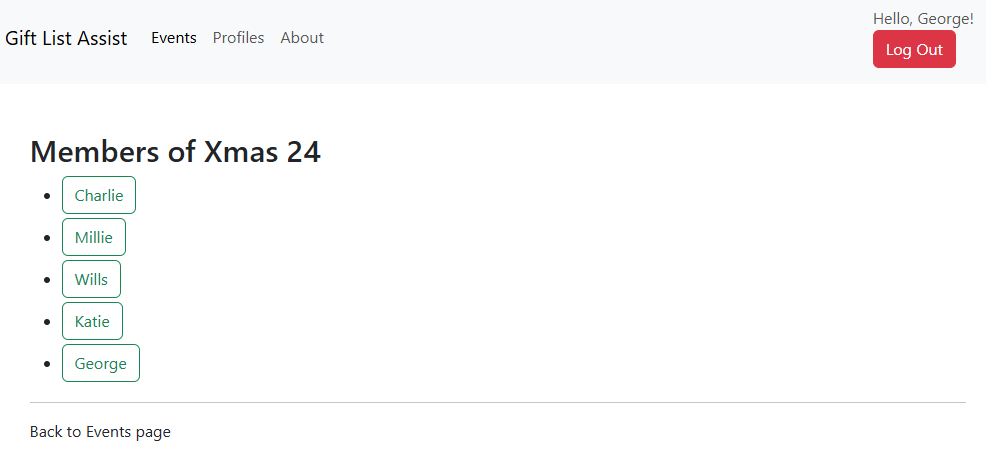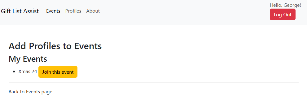 However George wasn't invited to Christmas 24 as his profile didn't exist then. Clicking 'Add profiles to existing events' and then 'Join this event' will allow Katie to add George to any event she's invited to.
